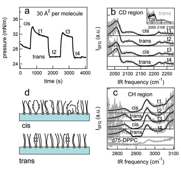 圖6:結果:DT Azo-5P/d75 DPPC的1:5混合物在脂質/水界面上的面積為60?2/分子。(a)表面壓力與時間的關系。370和450 nm光照射~100秒分別產生cis(高壓)和trans(低壓)狀態。壓力的微小劇烈波動是由于樣品高度的變化,以校正水的蒸發。(b)相應的VSFG光譜(灰色)以及CD區域的擬合。為了清晰起見,對光譜進行了偏移。(c)VSFG光譜(灰色)與fits一起引導眼睛進入CH區域。底部曲線顯示了P下純d75 DPPC的光譜~40 mN/m.(d)脂尾方向示意圖。光開關脂質的偶氮苯部分用灰色圓圈表示。