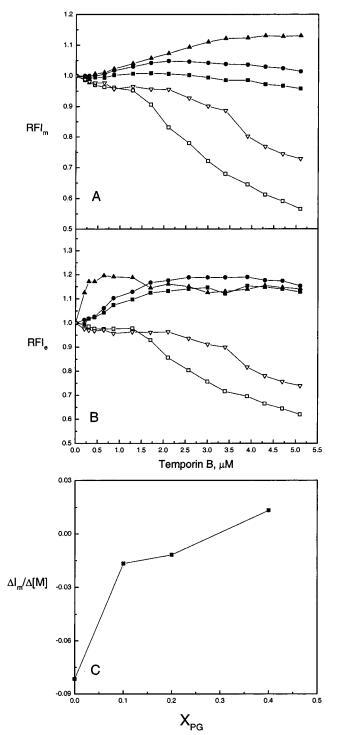 顳蛋白對雙層脂質動力學的影響。隨后通過記錄摻入LUVs的芘標記熒光磷脂類似物PPDPC(X)0.01)的發射光譜來研究肽與脂質體結合的后果。對于含有脂質類似物(如PPDPC)的單個芘部分,穩態Ie/Im值反映了膜中熒光團的橫向遷移率和局部濃度(18,19)。然而,我們之前的研究比較了兩種其他抗菌肽(馬蓋寧2和吲哚肽)對膜脂質動力學的影響,發現這些肽也影響芘標記脂質的量子產率(15)。對于SOPC LUV,添加temporin B分別導致芘單體和準分子發射Im和Ie的顯著減少,最大減少約40%(圖2,面板a和B)。芘熒光帶的猝滅是雙相的,當時間蛋白B與脂質的摩爾比約為1:12時,量子產率顯著降低(圖2,面板a和B)。在膽固醇(Xchol)0.10)存在的情況下,temporin B對芘單體和準分子熒光的猝滅也很明顯,盡管發射的減少量小于在SOPC LUV中觀察到的減少量(圖2,面板A和B)。然而,當酸性磷脂POPG存在于XPOPG)0.10時,Im中只有微不足道的變化是明顯的,當XPOPG從0.20增加到0.40時,時間蛋白B導致Im以漸進的方式增加,Im的初始增量在大約2/1的POPG/時間蛋白B化學計量比下趨于穩定。在達到飽和響應之前,Im中線性增量的斜率隨著XPOPG而增加(圖2,面板C)。在POPG存在的情況下,顳蛋白B也增加了Ie。在XPOPG)0.40時,Ie的值逐漸增加,直到顳蛋白B:脂質摩爾比為≈1:15,對應于≈1/6,而當超過該化學計量比時,Ie降低。圖3,面板A中顯示了由于顳蛋白B引起的Ie/Im的變化。具體而言,SOPC LUV的Ie/Im增加了1.1倍,而在膽固醇(Xchol)0.10的存在下,觀察到Ie/Im的微小變化,面板A)。將XPOPG從0.10增加到0.20會逐漸增強Ie/Im的增量。有趣的是,在XPOPG)0.40時,當時間蛋白B:脂質摩爾比為≈1:30.然而,在這一肽:脂比之上,顳葉素B導致Ie/Im降低,而在這一肽:脂比之上,Ie/Im的變化不顯著≈1:6.