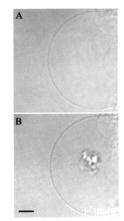 圖9:HMC圖像序列,說明了在添加肽之前(圖a)和應用肽后立即通過temporin L.巨大囊泡轉化SOPC/膽固醇(Xchol)0.10)巨大脂質體≈0.24 fmol的temporin L(面板B)。面板B中比例尺的長度對應于50μm。