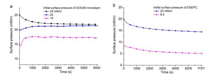 圖4.GO在不同表面壓力下對(a)DODAB和(b)DSEPC單層的吸附研究(表面壓力與經過時間的關系)。首先將單層壓縮至純水亞相上的一定表面壓力,然后小心地將600μL 1 mg/mL GO分散液緩慢注入單層下方的水亞相。