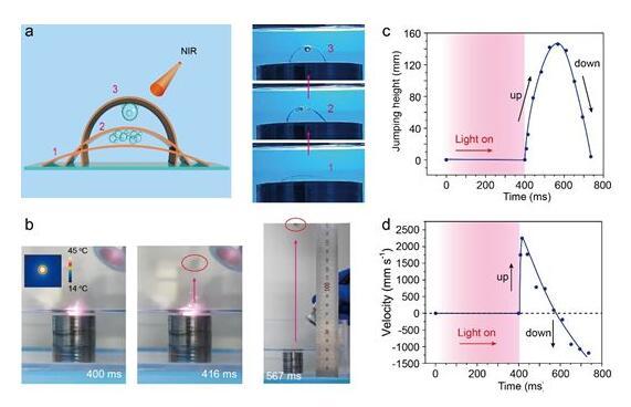 光刺激下驅(qū)動器可以在極短的響應(yīng)時間(400 ms)內(nèi)從液體介質(zhì)跳越到空氣中,最高速度為2 m/s,高度可達14.3 cm。