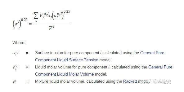 液體的表面張力系數(shù),是液體本身的一種性質(zhì),主要由液體本身決定。純物質(zhì)液體表面張力可用Macleod-Sugden 法 、Sastri-Rao 法、Brock-Bird 法或Pitzer 法估計(jì)[1]。純物質(zhì)液體表面張力可用擴(kuò)展的Macleod-Sugden 法估計(jì)[2]: