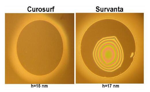 通過Curosurf和白蛋白將PEG 10000包含到混合FFs中不會(huì)改變膜類型,并且FFs仍然厚且不均勻。相反,葡聚糖的加入導(dǎo)致了顯著的變化:觀察到薄膜變薄且穩(wěn)定的黑色薄膜(h=15 nm),類似于在沒有白蛋白的情況下通過Curosurf獲得的薄膜(圖3)。