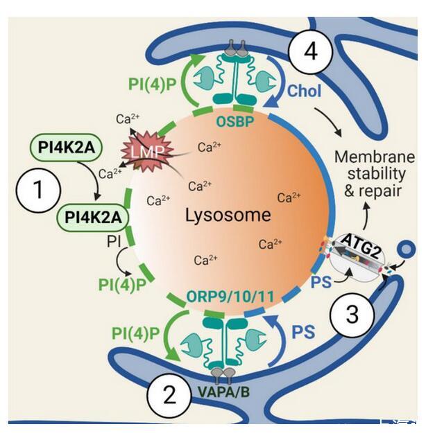 PI4P信號觸發了“警報系統”,有選擇性地對受損溶酶體進行標記。這將進一步招募ORP家族蛋白(包括ORP9/10/11和OSBP)——它們一端結合受損溶酶體上的PI4P,另一端結合在內質網上。內質網是細胞中最大的膜結構細胞器,負責脂質與蛋白質的合成。在ORP家族蛋白的幫助下,內質網與受損溶酶體緊密地結合起來。