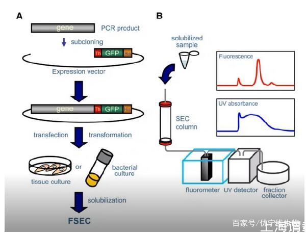 FSEC用于表達條件和去垢劑的快速篩選。FSEC(Fluorescence-Detection Size-Exclusion Chromatography),又叫熒光檢測尺寸排阻色譜法。具體方法是將目的基因構(gòu)建在帶有GFP標簽的融合表達載體上,進行小量表達。通過不同的去垢劑溶解后,然后上樣微量色譜柱,使用AKTA系統(tǒng)的紫外,熒光檢測器進行檢測(熒光檢測器需搭配)。由于目的蛋白帶有GFP標簽,使用熒光檢測會顯示出熒光信號。通過峰型和峰面積我們可以檢測到蛋白表達和溶解情況。