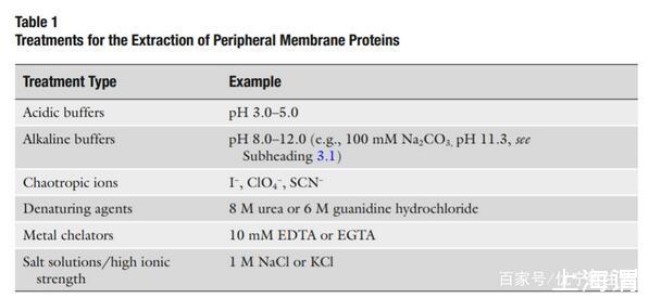 外周膜蛋白可以使用相對溫和的技術(shù)來分離,破壞外周膜蛋白和細胞膜之間的靜電作用或者氫鍵,而不破壞整個細胞膜。通常使用的試劑參見表一。使用含有高鹽離子濃度的緩沖液進行提取很有用因為他們會降低膜蛋白和帶有電荷的脂質(zhì)之間的靜電相互作用。