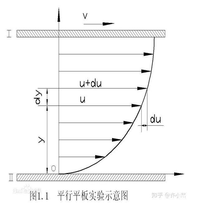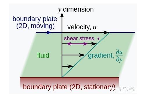 在這張圖中,下方的平板和兩個平板間的液體保持相對靜止,且液體內部沒有對自身體內不同質點的相對流動,而將上方平板做水平向右的推動??梢钥匆姡谂c上方平板直接接觸的一層液面處可以達到與被推動的平板相同的速度,而在垂直距離上越遠離上層平板的部分的速度越慢,直到最下層與下方平板直接接觸的液面處速度為零,在兩個平板之間存在一個連續變化的速度分布。