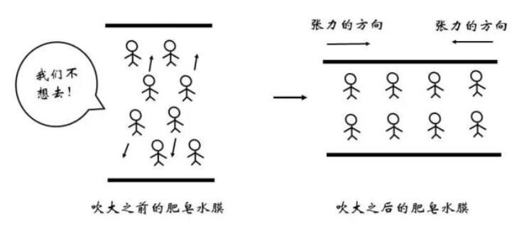 俗話說“物以類聚,人以群分”,更加相似的同類分子間往往關系更為融洽,而不同種分子間的關系則相對疏遠。在物理上表現為同類分子間的勢能曲線最低點更低。因此,對于一個存在于內部的水分子,如果來到表面,需要斷開與同類分子的部分關系,而代之以與比較“生疏”的空氣分子間的作用,顯然是不情愿的!這體現為能量的升高。那么,什么情況下水分子要從內部來到表面呢?正是吹泡泡的時候。