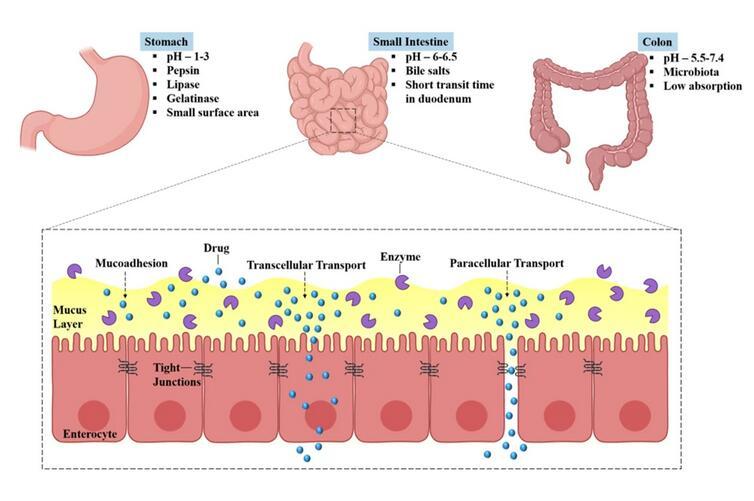 口服藥物在經(jīng)歷胃部的生理障礙后到達(dá)小腸。在小腸(十二指腸)的入口處,胰酶會(huì)引發(fā)幾種酶促轉(zhuǎn)化,這些酶還可能導(dǎo)致首過代謝,從而導(dǎo)致藥物生物利用度降低。因此,口服藥物必須克服這些生理學(xué)障礙。