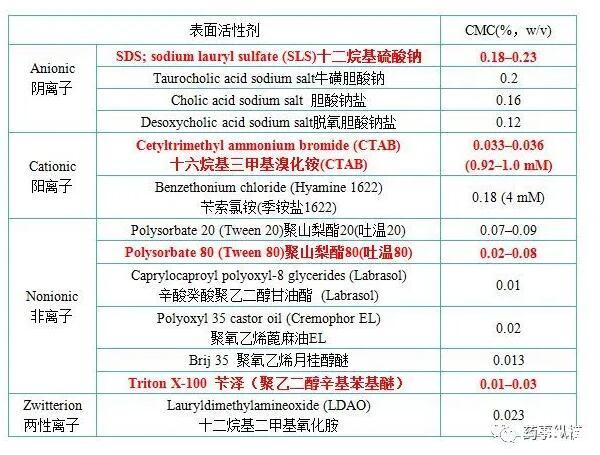 如果上述條件都不合適,可以考慮采用加入表面活性劑,此時(shí)應(yīng)查詢國內(nèi)外文獻(xiàn)、專利、質(zhì)量標(biāo)準(zhǔn),并結(jié)合藥物結(jié)構(gòu)選擇表面活性劑的種類。篩選時(shí),應(yīng)根據(jù)情況考慮涵蓋所有常用種類的表面活性劑,比如陰離子型、陽離子型、和非離子型。USP中列舉了多種商品化的表面活性劑及其臨界膠束濃度(Critical Micelle Concentration,CMC)的近似臨界值,在方法開發(fā)中可以參考。