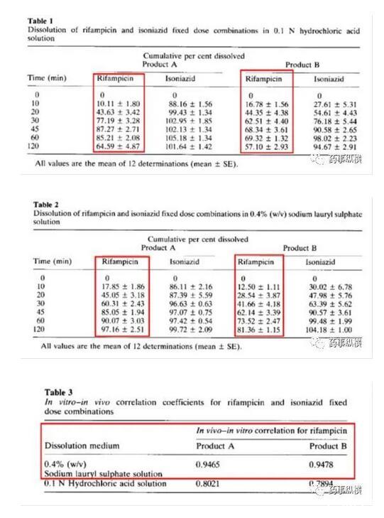 利福平與異煙肼復(fù)方制劑在進(jìn)行溶出曲線測(cè)定時(shí)發(fā)現(xiàn)利福平在0.1N鹽酸中不穩(wěn)定,發(fā)生降解。由于利福平在水中不溶,因此采用了0.4%SDS溶液進(jìn)行了研究,結(jié)果表明在整個(gè)分析檢測(cè)過程中無降解。而且,0.4%SDS溶液的體內(nèi)外相關(guān)性很好。