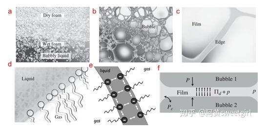 圖1.不同尺度下的泡沫結構及穩定機制(Ref 1)(a)整個泡沫結構,尺度為0.01 m至1 m。(b)干泡沫的放大部分,尺度為0.1 mm至1 cm。(c)液體通道,也叫Plateau邊界,尺度為1 um至0.1 mm以及肥皂泡膜,尺度為10 nm到1 um。(d)氣液界面的分子層結構,尺度為0.1 nm到10 nm。e-f)氣泡膜在界面靜電力排斥作用即楔裂壓(disjoining pressure)的作用下而穩定存在。