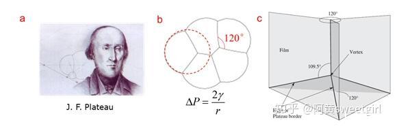 泡沫物理學集中于研究泡沫的結構、靜力學、動態演變及排液等內容。它是一個十分古老的學科,由比利時物理學家Plateau在19世紀中葉開創(圖2a)。Plateau在數十年的失明的時光里,依舊通過指導他侄子做試驗,堅持研究肥皂泡薄膜的幾何形態及其背后隱藏的力學規律。1873年,他和侄子把自己的實驗現象和分析結果做了系統整理,以法文發表,從此把對泡沫結構的研究由定性印象推到了量化階段,開創了泡沫物理學(Ref 2)。在泡沫靜力學方面,Plateau的主要貢獻在于其提出了干泡沫的靜態結構力學的三定律,它是后續泡沫研究的基石: