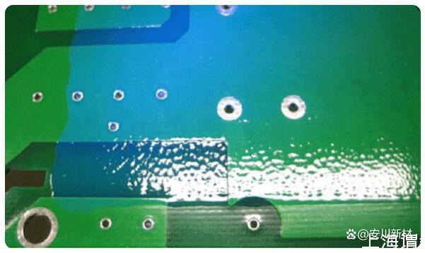 三防漆噴涂后,一般三防漆在PCB板自流平,有些自動化的噴涂工藝流平是通過傳送帶的速度來控制放置時間,稀釋劑揮發快,粘度高,導致未流平的區域流不平,出現表面凹凸現象,也就是桔紋現象。