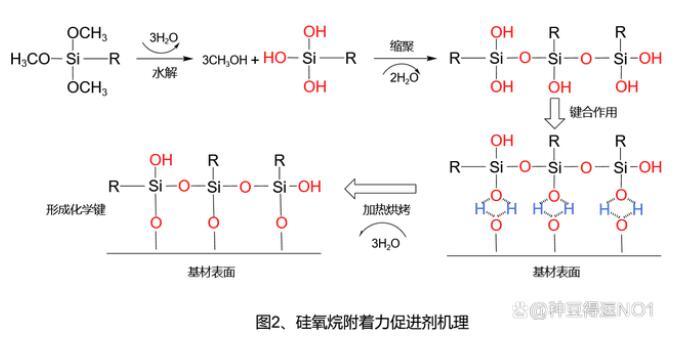 對于陶瓷、玻璃、塑料、金屬等基材,通過化學鍵合的作用能很好的促進涂層與基材之間的附著力,有機硅烷通過水解,形成的硅羥基能與基材表面的羥基,通過鍵合作用能很好的形成牢固的吸附層,同時R中的活性基團可以與樹脂中的基團形成交聯反應,從而在樹脂與基材之間形成架橋的作用。