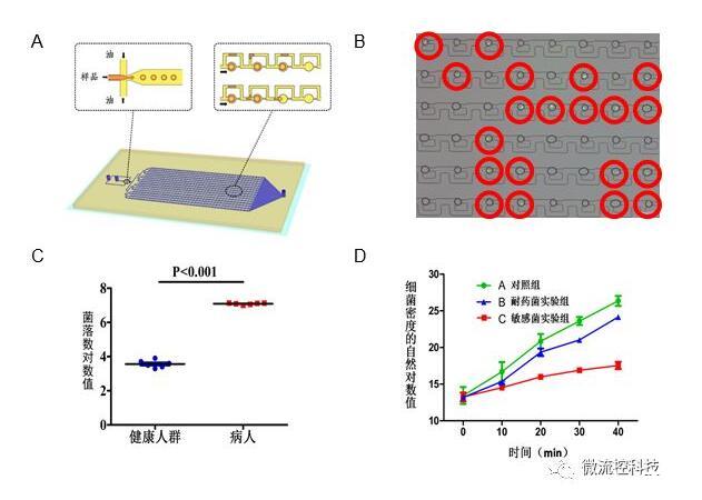 圖3A.液滴微流控芯片原理設(shè)計(jì)圖結(jié)構(gòu)包含上游的液滴生成區(qū)和下游的液滴捕獲區(qū);B.利用液滴熒光成像分辨細(xì)菌陽性和陰性液滴;C.液滴數(shù)字化分析顯示健康人和尿路感染病人尿液細(xì)菌計(jì)數(shù)差別;D.液滴數(shù)字化分析顯示敏感和耐藥細(xì)菌對于抗生素的反應(yīng)。