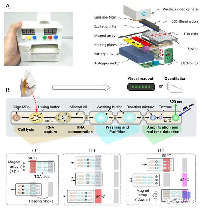 圖1液滴陣列微流控芯片核酸分析系統(tǒng)。A.分析儀器實(shí)物及結(jié)構(gòu)示意圖;B.分析原理示意圖。