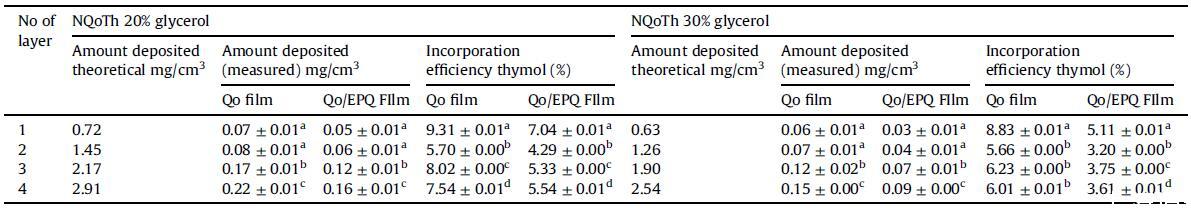 表3注射到薄膜Qo和Qo/EPQ中的百里酚量(mg/cm3)作為印刷次數的函數。不同字母表示顯著差異(p<0.05)。