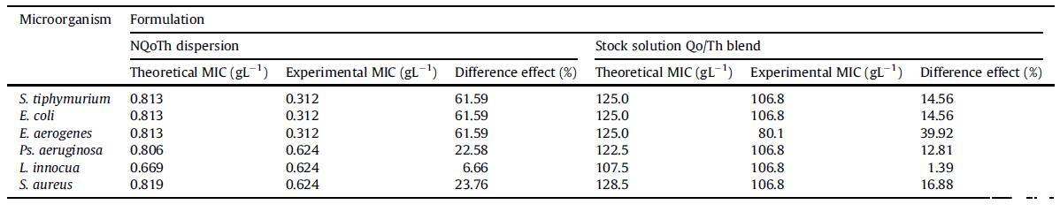 本研究的一個目標是確定對微生物的影響是否是由于組分的協同或相加作用。通過根據NQoThs中存在的百分比(QoLMW為75%,Th為25%)對QoLMW和Th的MIC進行加權,將NQoThs的MIC與附加效應的估計值進行比較。NPs(NQoTh)和QoLMW/Th原液的MIC值均低于基于組分加和效應估計的MIC,表明Qo和Th之間存在協同效應(見表5)。然而,取決于測試的細菌,NPs的MIC比庫存QoLMW/Th混合物低大約1.5到4.5倍。Wazed Ali、Rajendran和Joshi(2011)評估了使用TPP從440-kDa Qo的1.0%(w/v)溶液中產生的NQo(115.5 nm)的AM抗金黃色葡萄球菌。NQo比Qo原液更有效地抑制這些細菌的生長50%。