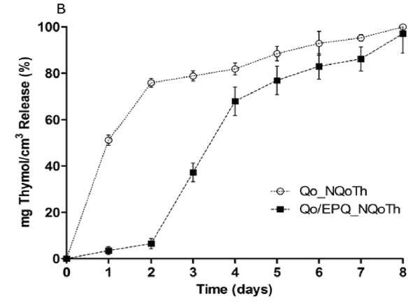 圖6.從使用NQoTh印刷4次的薄膜Qo和Qo/EPQ中釋放百里酚(A)0天(初始負載Th)、第1天和第8天的釋放曲線和(B)室溫下8天測定的百里酚釋放動力學溫度。