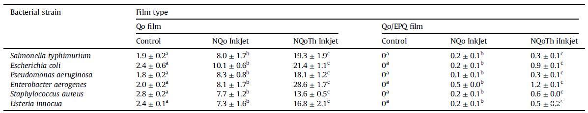 表6通過熱噴墨將NQo和NQoTh結合到Qo和Qo/EPQ薄膜中的徑向擴散的生長抑制區(mm2)。對于每種納米顆粒溶液,薄膜印刷4次。不同字母表示顯著差異(p<0.05)。