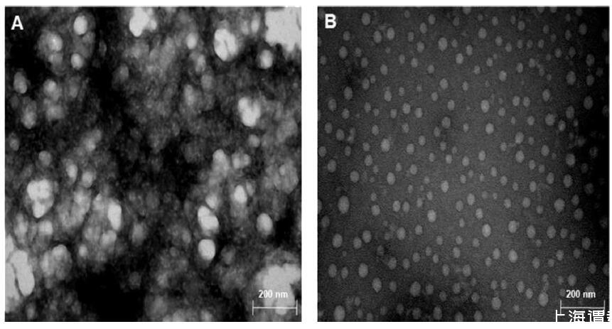 含30%(w/v)甘油(417.4±53.1 nm)的NP的Z平均值比含20%(w/v)甘油(383.8±58.8 nm)的NP觀察到的高25%。尺寸通過TEM顯微鏡確定。圖1顯示了在沒有甘油(圖1A)和添加20%(w/v)甘油(圖1B)的情況下NQoThs的顯微照片。如上所述,添加20%甘油抑制了NP團聚。表2比較了TEM和動態光散射(DLS)確定的NP尺寸。使用DSL確定的值比TEM確定的值高近10倍,因為TEM直接測量干燥樣品,而Zetasizer系統確定尺寸首先通過DLS測量樣品中由于周圍粒子轟擊(布朗運動)而引起的液體中粒子的隨機運動,然后使用StokeseEinstein方程(Akbari、Pirhadi和Zandrahim,2011年)從該運動中推斷出大小。