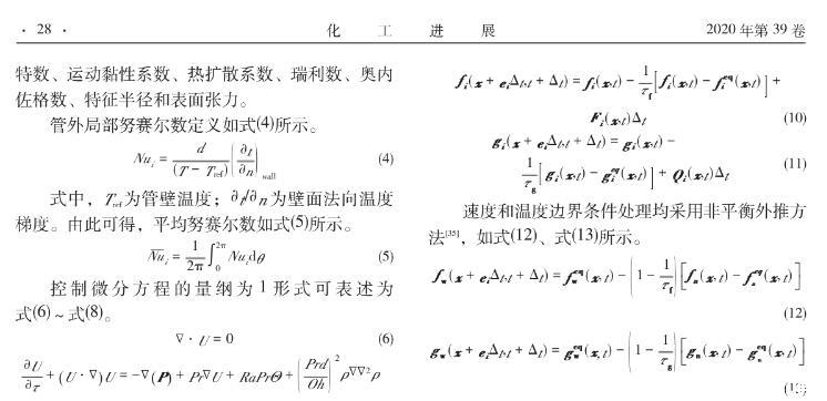 【摘要】:采用格子-玻爾茲曼方法 (LBM)構(gòu)建了考慮表面張力影響下封閉腔體內(nèi)加熱圓柱外自然對流數(shù)學(xué)模型。在分別對自然對流與表面張力模型模擬驗(yàn)證的基礎(chǔ)上,探究了液固表面張力與重力場下浮升力同時(shí)作用下加熱圓柱外流體自然對流的傳熱特性。結(jié)果表明,在給定Ra數(shù)下(103≤Ra≤106),隨著表面張力的增大(Oh數(shù)減小),封閉腔體內(nèi)管外自然對流擾動會加劇,流型會變復(fù)雜,壁面換熱效率有明顯提高。