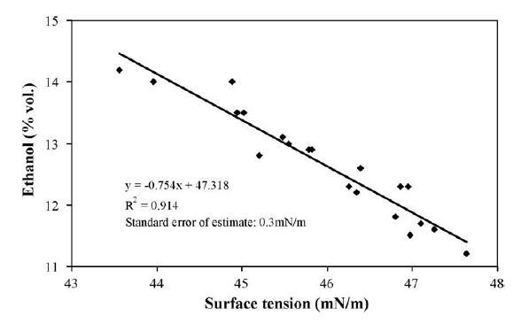如統(tǒng)計分析所示,乙醇、單寧和蛋白質(zhì)是與表面張力最相關(guān)的三個參數(shù)。 一方面考慮到它們在釀酒學上的重要性,另一方面考慮到它們的測定方法費力,我們使用回歸分析研究了各種數(shù)學模型,目的是通過簡單的表面測量獲得評估其濃度水平的預(yù)測模型。緊張。 正如預(yù)期的那樣,最適合的模型用于估計乙醇含量。 描述它的散點圖和線性方程如圖 2 所示。該模型將乙醇濃度的變化解釋為 91.4%,估計的標準誤差等于 0.3 mN/m。