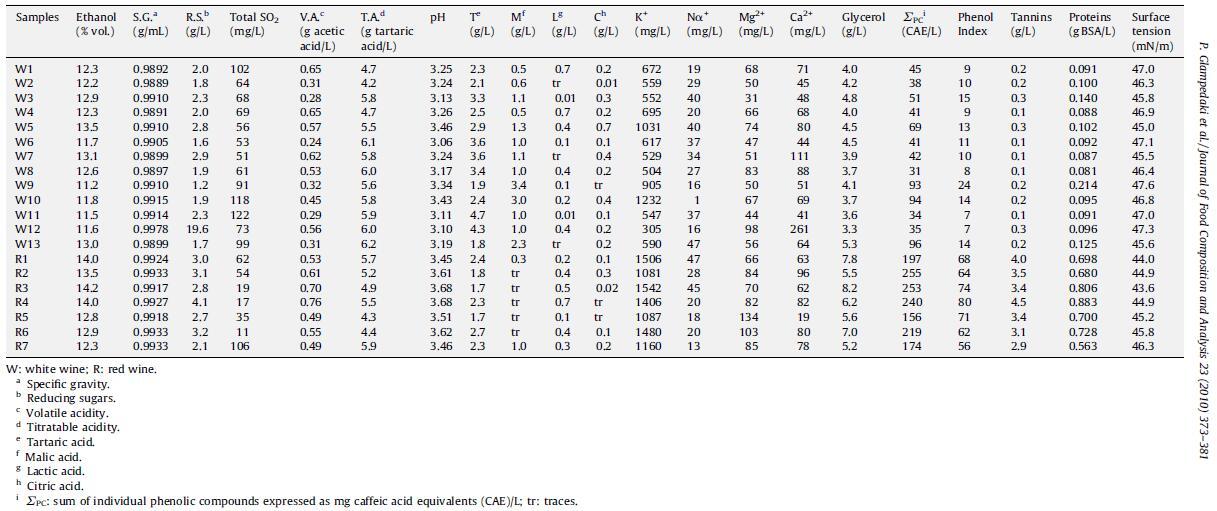為此,對 20 種靜止、白色和紅色希臘單品種葡萄酒樣品進行了常規(guī)釀酒學參數(shù)(乙醇含量、比重、還原糖、可滴定酸度、揮發(fā)性酸度、總 SO2 和 pH 值)和表面張力的測定。 還進行了使用 HPLC 測定有機酸(酒石酸、蘋果酸、乳酸和檸檬酸)、陽離子(鉀、鈉、鎂和鈣)、甘油和酚類化合物以及使用氣相色譜法測定揮發(fā)性化合物的基本儀器分析。 最后,采用光譜法進行總酚指數(shù)、單寧和蛋白質(zhì)測定。 結(jié)果如表 2 和表 3 所示。關(guān)于蛋白質(zhì)測定,可能影響所有樣品的系統(tǒng)分析誤差可視為不影響最終值,因為所研究的葡萄酒具有相似的乙醇含量。 此外,在葡萄酒樣品中加入已知量的標準 BSA 溶液進行的分析未發(fā)現(xiàn)對蛋白質(zhì)測定有任何干擾(數(shù)據(jù)未顯示)。 上述數(shù)據(jù)與表面張力的相關(guān)性分析結(jié)果如表4所示。
