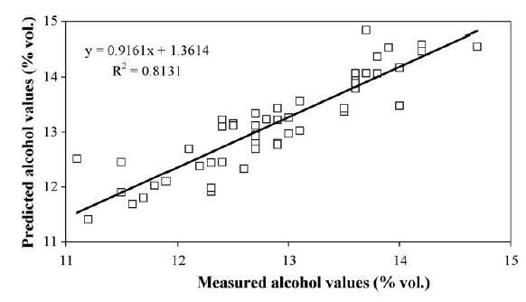 為了測試乙醇預(yù)測模型,我們分析了第二組 30 個葡萄酒樣品。 所提出的線性模型預(yù)測的值與葡萄酒酒精度等級的測量值的圖如圖 3 所示。更新的模型解釋了 81.3% 的乙醇含量變化,而現(xiàn)在估計的標準誤差為 0.36 % (v/v)。 盡管必須進一步優(yōu)化,但該統(tǒng)計工具為文獻中現(xiàn)有的那些提供了一種額外的方法,用于簡單快速地估計靜止葡萄酒的酒精等級(Rocchia 等,2007a,b)。