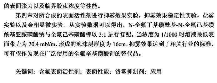 第四章對所合成的表面活性劑進行抑霧效果實驗,抑霧效果穩(wěn)定性實驗,鹽霧實驗以及金相顯微實驗。從實驗數(shù)據(jù)可以得出,N-全氟丁基磺酰基-N-全氟己基磺酰基亞胺磺酸鈉與全氟己基磺酸鉀以3:1進行復(fù)配,當濃度為1/1000時溶液最低表面張力為20.4mN/m,形成的泡沫層厚度為16cm,抑霧效果達到了相關(guān)行業(yè)的標準,可有望作為現(xiàn)在廣泛使用的全氟辛基磺酸鉀的替代品。