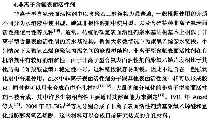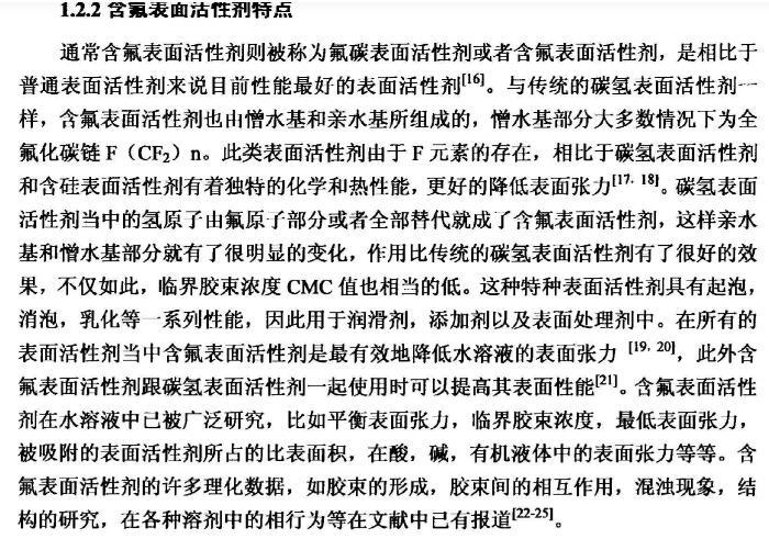 【摘要】:本論文首先對新型含氟表面活性劑的特性,應(yīng)用領(lǐng)域,國內(nèi)外研究進展進行了全面的綜述。含氟表面活性劑是目前最受青睞的特種表面活性劑,相比于傳統(tǒng)的碳氫表面活性劑,含氟表面活性劑的用量少,降低水溶液表面張力的作用強,同時可以跟其它表面活性劑起到很好的復(fù)配效果,可以應(yīng)用于消防、鉻霧抑制劑、造紙、冶金、起泡與消泡劑的合成等很多領(lǐng)域。