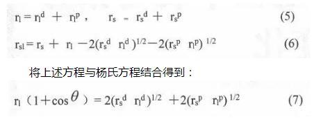 OWRK理論將液體的表面張力和固體的表面能分別分解為獨立的色散分量和極性分量,固液兩接觸相間的界面張力滿足如下公式: