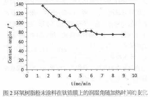 由圖2可知,環氧樹脂粉末涂料在熔融鋪展過程中的對鈦鋯膜的潤濕角整體呈降低趨勢,潤濕角由1.5min時的136°逐步降低至流平終點的74.6°。