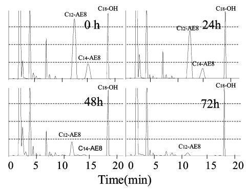 用高效液相色譜法分析生物降解過程中AE 的色譜圖如圖8 所示,其中10 毫克/升C12-AE9 的峰出現(xiàn)在11 分鐘的保留時間,作為內(nèi)標(biāo)的C18 醇出現(xiàn)在18 分鐘的保留時間。 在 8 分鐘的保留時間之前觀察到主要由衍生產(chǎn)物引起的干擾峰。 10mg/L AE9 的大部分峰在 48 小時后消失(圖 8),而圖 3 中此時基于需氧量的生物降解保持 35%。此時表面張力值達(dá)到約 72.8 mN/m . 因此,表明AE9在其生物降解率低于50%的時間內(nèi)失去了其界面活性和水生毒性。