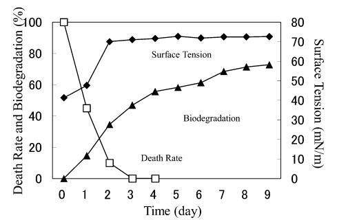 AE 的生物降解速度比 LAS 快。 對于 10 mg/L AE9,BOD 和表面張力值在測試開始后立即開始增加,死亡率立即下降(圖 3)。 表面張力值在第 2 天達(dá)到約 72.8 mN/m。 該結(jié)果與之前的報告一致9),其中比較了基于 CO2 量的生物降解率(測量的 CO2 產(chǎn)量/理論 CO2 產(chǎn)量)和 CTAS 的降低率。 也就是說,Strum 研究中 CTAS 的降低對應(yīng)于我們研究中表面張力值的增加。