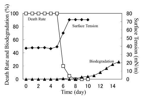結(jié)果,在第8天重新加入LAS使試液的表面張力降低到與初始階段相同的水平,但死亡率沒有達(dá)到100%。 重新添加后不久,觀察到表面張力值迅速增加,水生毒性和死亡率迅速下降。 重新添加 LAS 后,死亡率暫時增加,但隨后立即降至 0%。 重新添加后第 2 天,表面張力值達(dá)到約 72.8 mN/m。