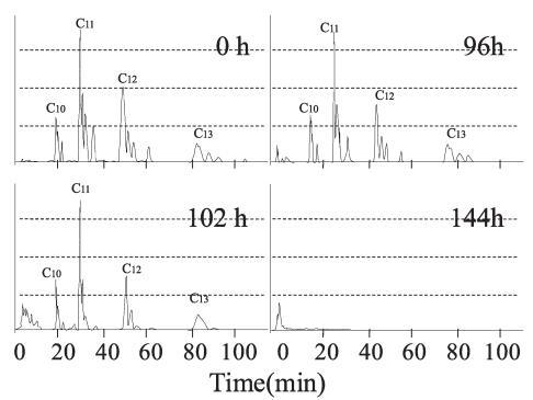 生物降解過程中10mg/L LAS的色譜圖,通過HPLC使用UV檢測器進(jìn)行分析,如圖6所示。在相應(yīng)的保留時間(RT)處出現(xiàn)不同碳鏈數(shù)的峰組:16至19.5分鐘為C10,26.5至32.5分鐘是C11,44到55分鐘是C12,74到95分鐘是C13。 由于苯基的結(jié)合位置不同,每個峰組都包含異構(gòu)體峰。 參考標(biāo)準(zhǔn)(和光純藥工業(yè)株式會社)用于識別每個峰。