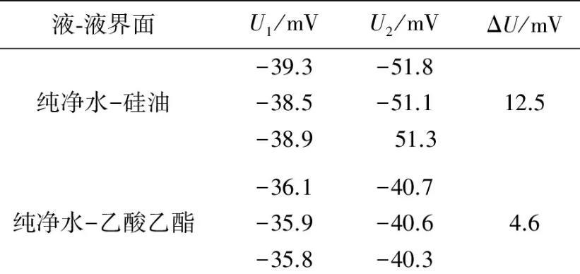 實驗測量所用金屬吊環的外徑、內徑分別為0.034 96 m和0.033 10 m.在20℃實驗條件下,采用自制2種液體間界面張力的動態實時測量儀,測量了純凈水-硅油和純凈水-乙酸乙酯間的界面張力.測量出金屬吊環由液體I中完全進入液體Ⅱ的過程中,液體I的液膜被拉斷前電壓的最大值U1,拉斷后趨于穩定時的電壓值為U2,數據結果如表1所示。