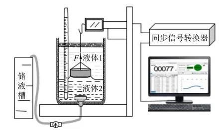 圖1為自制2種液體間界面張力的動態實時測量裝置圖,該儀器主要包括電腦顯示器、同步信號轉換器、自制實驗架臺、力敏傳感器、金屬吊環、恒溫杯、溫度計、排液孔、排液管、流速調節器和儲液槽等組成.