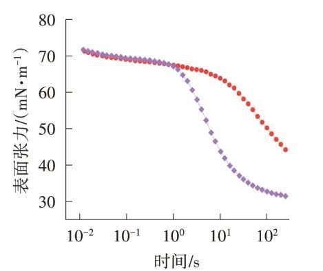 使用動(dòng)態(tài)表面張力儀用泡壓法進(jìn)行測(cè)定。C10~13MADS和2A1樣品溶液質(zhì)量濃度為1.0 g/L,測(cè)量前靜置24 h;測(cè)試溫度為(25.0±1.0)℃,有效時(shí)間為0.01~250.00 s。