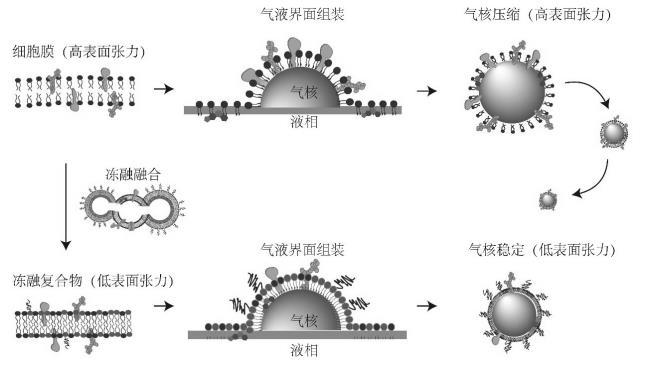 細(xì)胞膜是由蛋白質(zhì)與膽固醇等分子鑲嵌在磷脂中的典型雙分子層結(jié)構(gòu)。細(xì)胞膜仿生技術(shù)已經(jīng)成功實(shí)現(xiàn)在納米顆粒以及納米液滴表面修飾組裝,并實(shí)現(xiàn)體內(nèi)的長(zhǎng)循環(huán)以及良好生物相容性。典型的細(xì)胞膜仿生技術(shù)是將剝離后的細(xì)胞膜直接以磷脂雙分子層的形式包被于納米顆粒或液滴表面。然而由于表面張力作用,細(xì)胞膜的磷脂雙分子層無法直接包被在微米級(jí)的氣泡表面。