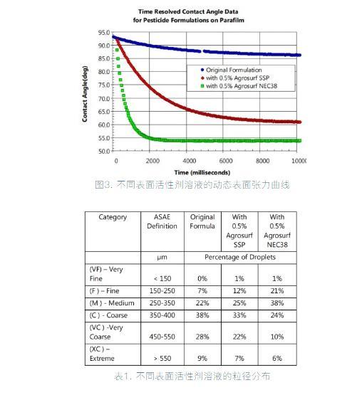 從圖3和表1示例曲線可以明顯看到,可以通過控制動(dòng)態(tài)表面張力來優(yōu)化霧滴的粒徑,張力在一定時(shí)間內(nèi)下降的越快,霧滴粒徑越細(xì)膩。為了避免霧滴尺寸過小而產(chǎn)生霧滴的漂移,可以將表面活性劑的張力調(diào)控在一定范圍。
