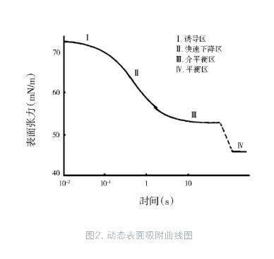 許多體系的動(dòng)態(tài)表面張力和時(shí)間對(duì)數(shù)的曲線可分為4個(gè)階段:誘導(dǎo)區(qū)、表面張力快速下降區(qū)、介平衡區(qū)和平衡區(qū)。在誘導(dǎo)區(qū),由于吸附在界面層上的助劑質(zhì)量濃度太低,溶液的表面張力較大;隨著助劑大量被吸附到溶液表面,表面張力急劇降低,就形成了快速下降區(qū);而隨著溶液表面助劑分子的積累,吸附接近飽和時(shí)吸附速度變慢,就形成了介平衡區(qū);足夠長(zhǎng)的時(shí)間后當(dāng)表面吸附達(dá)到飽和體系進(jìn)入動(dòng)態(tài)平衡階段表面張力達(dá)到平衡,此即為平衡表面張力。表面活性劑種類和質(zhì)量濃度不同,其溶液體系達(dá)到上述各階段所需時(shí)間不同,表現(xiàn)為各溶液體系間動(dòng)態(tài)表面活性的差異。